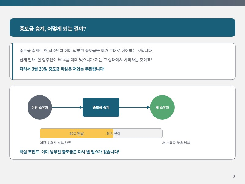 일단 제가 알아본 바로는, 중도금 승계란 현 집주인이 이미 납부한 중도금을 제가 그대로 이어받는 거예요. 쉽게 말해서, 현 집주인이 60%를 이미 냈으니까 저는 그 상태에서 시작하는 거죠! 그래서 첫 번째 질문에 대한 답은...