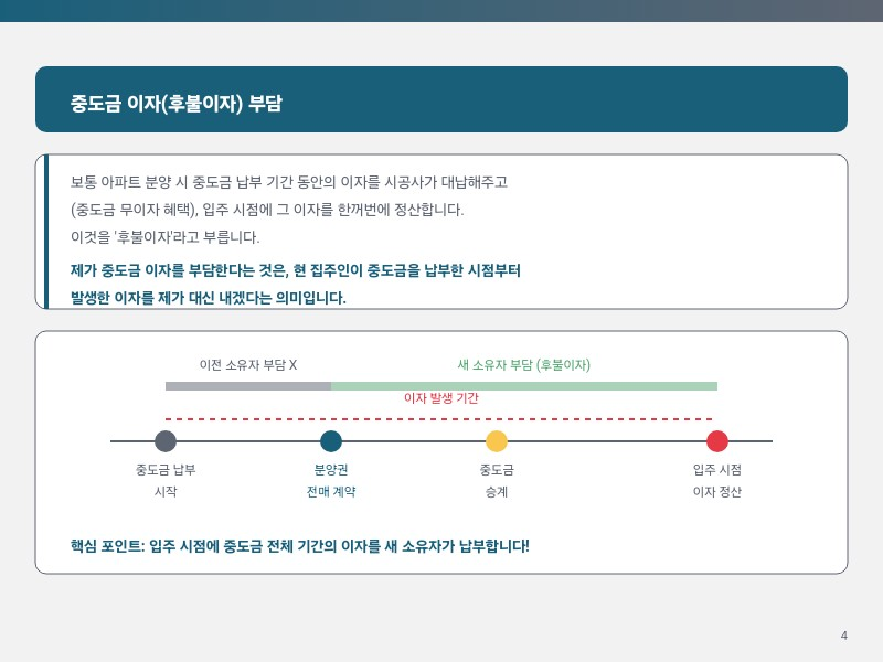 제가 계약할 때 중도금 이자(후불이자)는 제가 부담하기로 했다고 하셨죠? 이건 정확히 무슨 의미일까요?