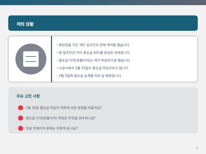 결국, 3월 20일 중도금 마감은 저와는 직접적인 관련이 없어요. 이미 60%가 완납된 상태라면, 저는 그 상태를 그대로 이어받는 거니까요. 다만, 중도금 이자는 제가 부담하기로 했으니, 입주 시점에 그 이자를 정산해야 한다는 점은 기억해두세요!